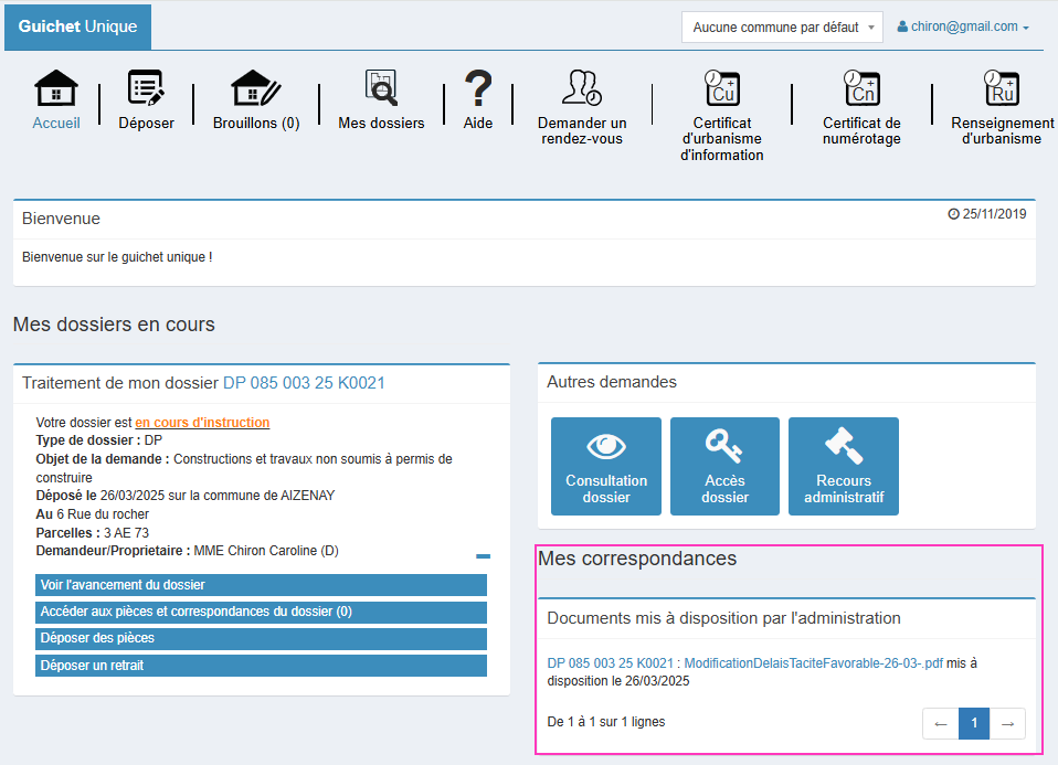 Retrouvez la liste des derniers documents mis à disposition par l'administration directement en page d'accueil via la section Mes Correspondances\Documents mis à disposition par l'administration.