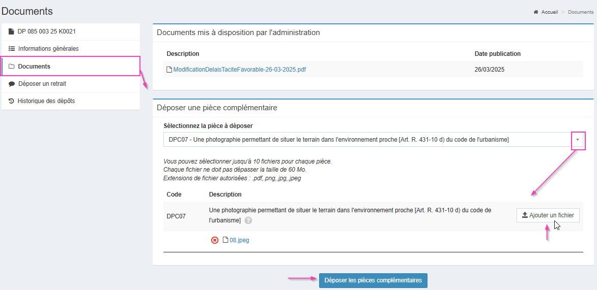 Vous serez alors redirigé sur l'état d'avancement du dossier à l'étape [Documents]. Ajouter alors le(s) fichier(s) demandé(s). Sélectionnez alors le type de pièces à déposer au niveau de la section "Déposer une pièce complémentaire" puis ajoutez les fichiers correspondants tout en respectant le nombre, la taille et l'extension des fichiers autorisés. Renouvelez l'opération si nécessaire. Cliquez sur [Déposer une pièce] pour valider votre dépôt.